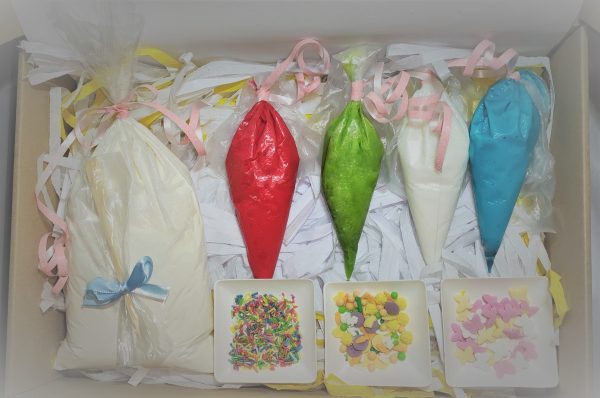 • 4 db süti dekor mázt habzsákban: elegáns fehér (75 gramm), mosolygós málnapiros (50 gramm), megkapó égkék (50 gramm) és derűs fűzöld (50 gramm) színekben